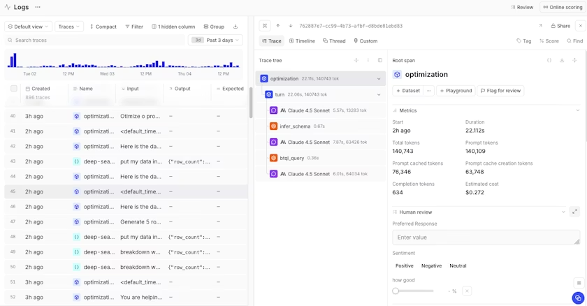 Track cost per request, per user, and by feature. Identify expensive patterns before they scale. Monitor latency at each step to find bottlenecks. Braintrust breaks down costs by prompt and completion tokens across models.
