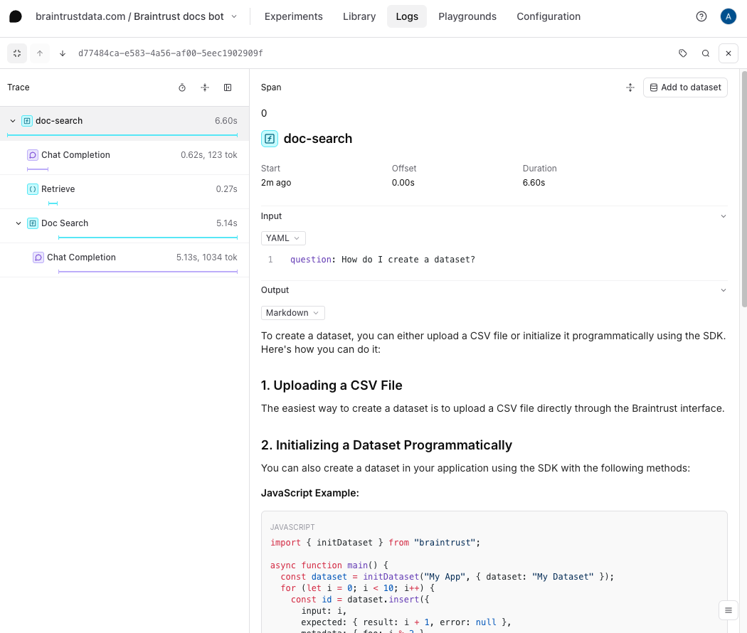 Retrieval augmented generation (RAG) is a powerful technique for adding context to your LLM responses. However, retrieving the context typically involves API calls, and therefore, you can only iterate on RAG applications in your codebase. In Braintrust, you can simplify this workflow by instead pushing the retrieval tool from your codebase to our UI, then iterating with prompts and models in an intuitive interface until you get your desired results.
